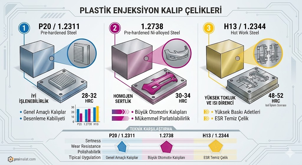 - 1.2311 (P20): Genel amaçlı kalıp hamilleri ve orta ölçekli üretimler için standarttır. İyi işlenebilirlik ve desenleme (tekstür) kabiliyeti sunar.